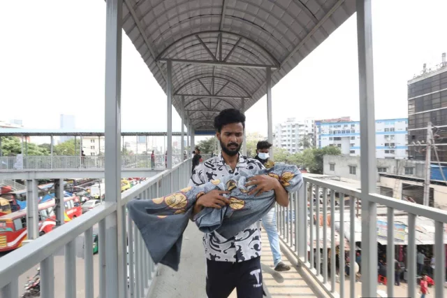 রাজধানীর মহাখালী এলাকায় ফুটওভার ব্রিজ পার হয়ে কোলে শিশুর নিথর দেহ নিয়ে হাঁটছেন এক যুবক-এমন একটি হৃদয়বিদারক দৃশ্য সামাজিক যোগাযোগমাধ্যমে ছড়িয়ে পড়ে। জানা গেছে, শিশুটির নাম সাদমান, বয়স মাত্র তিন বছর বা ৪ বছর। সে হামে আক্রান্ত হয়ে মারা গেছে।মঙ্গলবার (২১ এপ্রিল) এমন কয়েকটি ছবি সামাজিক যোগাযোগ মাধ্যমে ভাইরাল হয়েছে।প্রকাশিত ছবিগুলোর ক্যাপশন থেকে জানা গেছে, কামরাঙ্গীরচর থেকে ঢাকা উত্তর সিটি করপোরেশনের (ডিএনসিসি) হাসপাতালে চিকিৎসা নিতে সাদমান নামের ওই শিশুটিকে নিয়ে আসছিল তার পরিবার। কিন্তু শেষ পর্যন্ত তাকে বাঁচানো যায়নি। প্রকাশিত ছবিগুলোতে দেখা যায়, এক যুবক কাপড়ে মোড়ানো শিশুর মরদেহ কোলে নিয়ে বাড়ি যাচ্ছেন। এ ছাড়া হাসপাতালের সামনে ৩ নারীকে কাঁদতে দেখা গেছে। উল্লেখ্য, এ বিষয়ে ছবিতে থাকা ব্যক্তি ও শিশুটির পরিবারের সঙ্গে যোগাযোগ করা যায়নি। এদিকে সোমবার সকাল থেকে মঙ্গলবার সকাল পর্যন্ত ২৪ ঘণ্টায় নিশ্চিত হামে একজনের ও হাম সন্দেহে আরও দুজনের মৃত্যু হয়েছে।স্বাস্থ্য অধিদপ্তর সূত্রে জানা যায়, ২৪ ঘণ্টায় সন্দেহজনক হাম রোগী পাওয়া গেছে ১ হাজার ১৫৯ জন এবং ১৫ মার্চ থেকে ২১ এপ্রিল সকাল পর্যন্ত সন্দেহজনক হাম রোগীর সংখ্যা ২৫ হাজার ৯৩৫জন। ২৪ ঘণ্টায় নিশ্চিত হাম রোগী ১৮৮ জন, এ পর্যন্ত নিশ্চিত হাম রোগীর সংখ্যা ৩ হাজার ৮০৫ জন। এ পর্যন্ত সন্দেহজনক হাম রোগ নিয়ে হাসপাতালে ভর্তি হয়েছেন ১৭ হাজার ৯৫ জন।একই সময়ে সুস্থ হয়ে হাসপাতাল থেকে ছাড়পত্র পেয়েছেন ১৪ হাজার ১০৬ জন। প্রাদুর্ভাব শুরুর পর নিশ্চিত হামে ৩৮ এবং সন্দেহজনক হামে ১৮৫ জনের মৃত্যু হয়েছে।