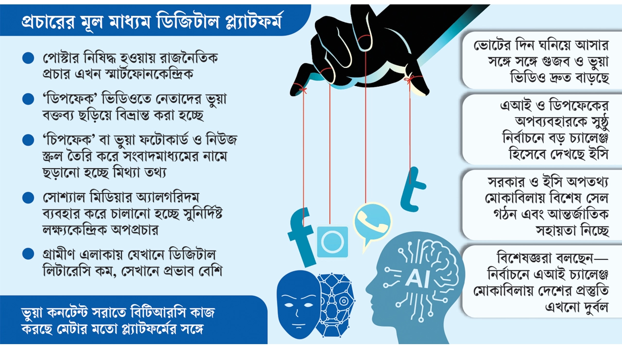 বিশেষজ্ঞরা বলছেন, এবারের নির্বাচনে কৃত্রিম বুদ্ধিমত্তা বা এআইর ব্যবহার প্রচার কার্যক্রমে যেমন গতি এনেছে, তেমনি তৈরি করেছে চরম ঝুঁকি। কারণ ব্যাখ্যা করে তারা বলছেন, প্রভাবশালী রাজনৈতিক নেতাদের কণ্ঠস্বর ও অবয়ব হুবহু নকল করে তৈরি করা হচ্ছে ‘ডিপফেক’ ভিডিও। এসব ভিডিওতে নেতাদের এমন সব বিতর্কিত বক্তব্য দিতে দেখা যাচ্ছে, যা তারা কখনোই বলেননি। এআই প্রযুক্তি ব্যবহার করে সংবাদ উপস্থাপকের আদলে ভিডিও বানিয়ে মিথ্যা তথ্য প্রচার করা হচ্ছে, যা সাধারণ ভোটারদের কাছে বিশ্বাসযোগ্য মনে হতে পারে। সোশ্যাল মিডিয়ার অ্যালগরিদম ব্যবহার করে নির্দিষ্ট গোষ্ঠীর কাছে উসকানিমূলক বা একপাক্ষিক তথ্য পৌঁছে দেওয়া হচ্ছে, যা ভোটারদের নিরপেক্ষ সিদ্ধান্ত গ্রহণে প্রভাব ফেলতে পারে। সেজন্য নির্বাচন কমিশনের পাশাপাশি আইনশৃঙ্খলা বাহিনীকেও নির্বাচনকেন্দ্রিক এসব প্রোপাগান্ডা মোকাবিলায় তৎপর থাকতে হবে।