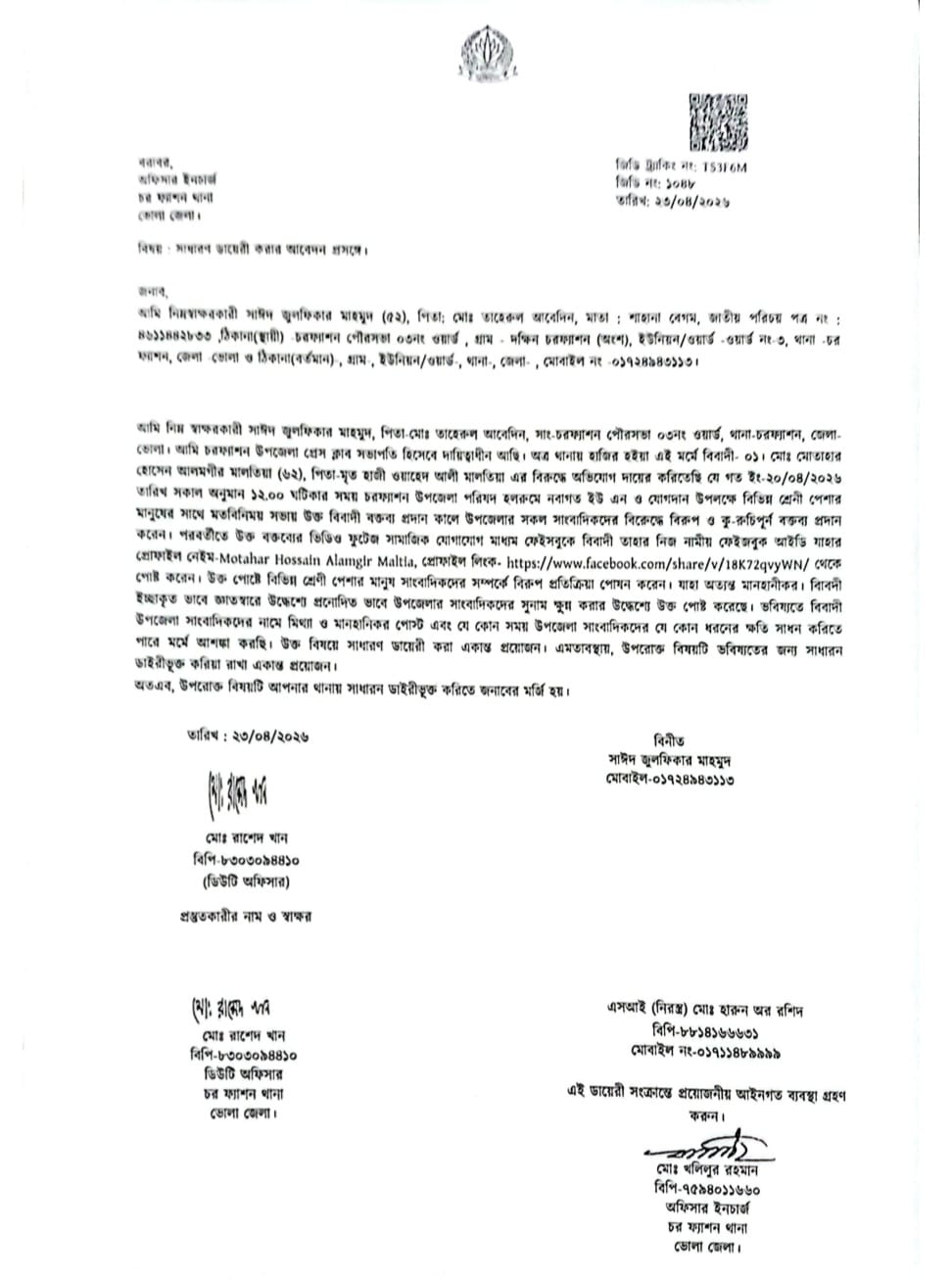 চরফ্যাশন থানার ভারপ্রাপ্ত কর্মকর্তা (ওসি) খলিলুর রহমান জানান, ‘প্রেসক্লাব সভাপতির পক্ষ থেকে একটি লিখিত অভিযোগ আমরা পেয়েছি এবং সেটি সাধারণ ডায়েরি হিসেবে নথিভুক্ত করা হয়েছে। পুরো বিষয়টি খতিয়ে দেখা হচ্ছে। তদন্ত সাপেক্ষে পরবর্তী আইনি পদক্ষেপ নেওয়া হবে।’